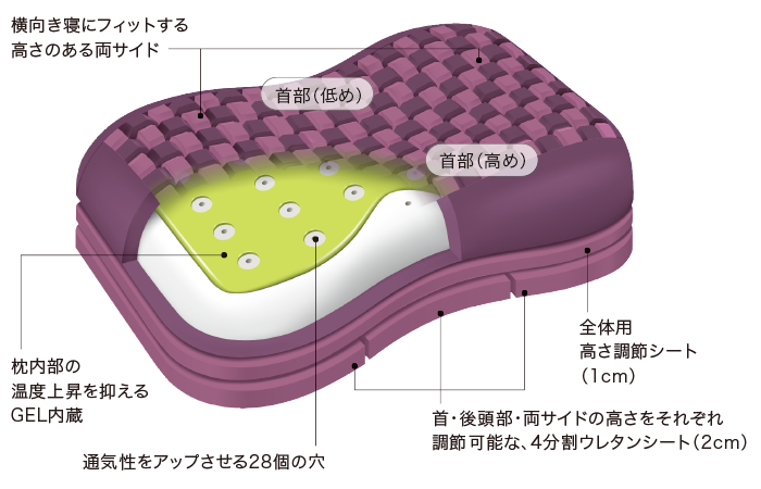横向き寝ゾーン:丸型シート入り/コラーゲン加工/3ヵ所高さ調節 |