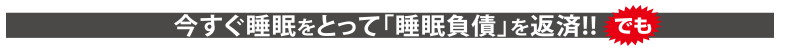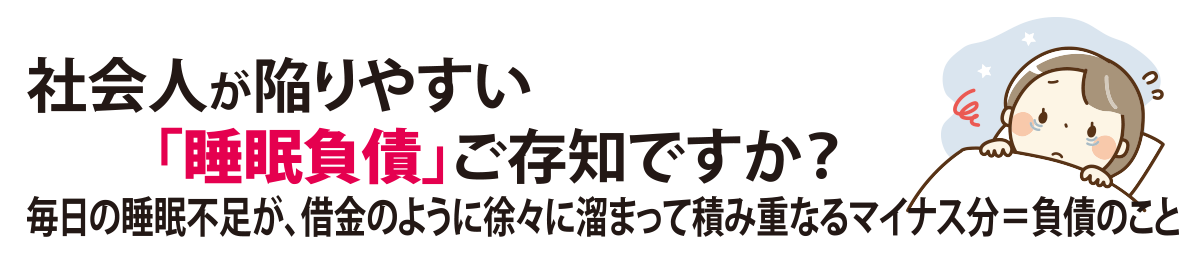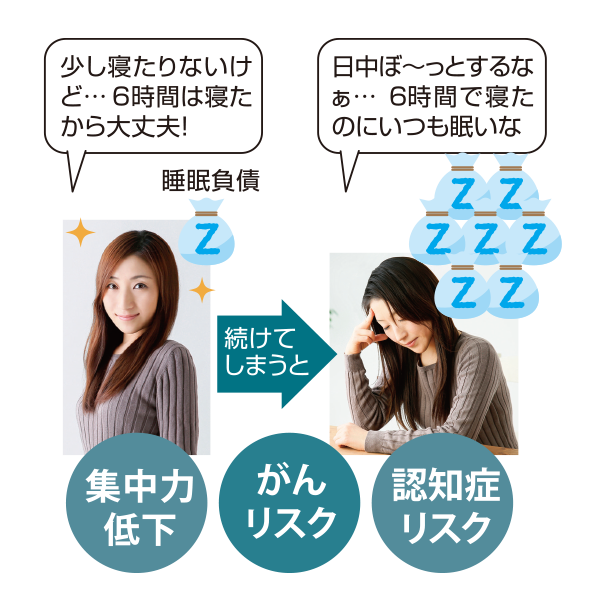 自分では気づけない?「睡眠負債亅とは「睡眠負債」は様々な病気のリスクを高め、日々の生活の質を下げていることが明らかになってきています。ですが自覚が難しく、とある実験では「6時間睡眠を2週間続けた脳は、2晩徹夜したのとほぼ同じ状態」と結果がでましたが、本人たちは自覚がなかったそうです。 そんな睡眠負債の返済は単純で「これまでより長く寝るだけ」それ以外の方法はありません。