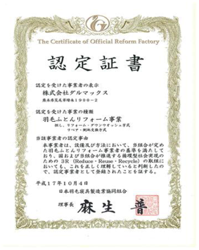 当店は「羽毛ふとんリフォーム事業認定工場」で